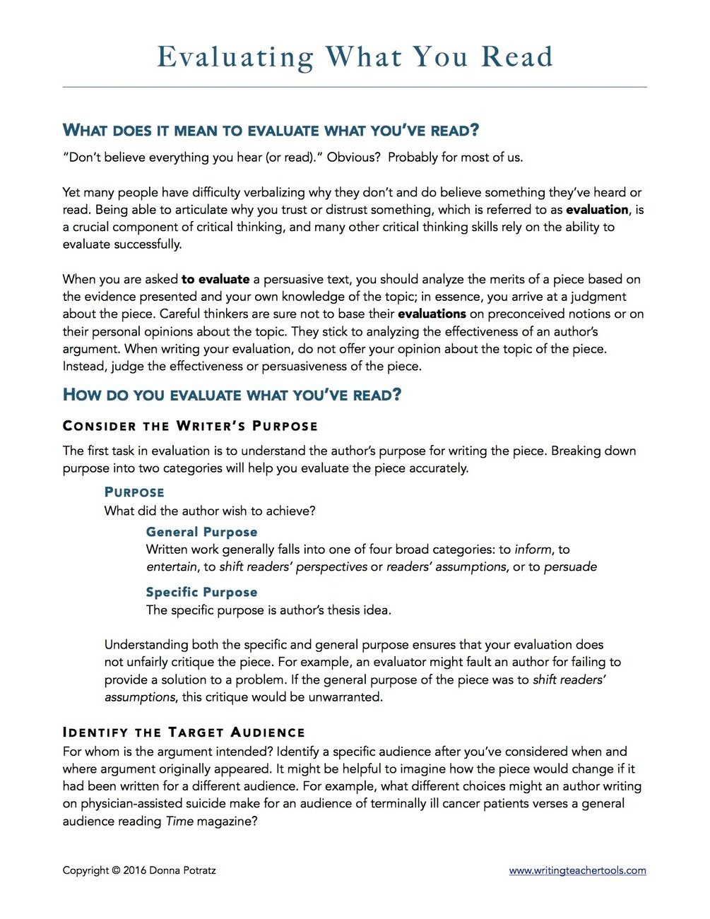 Documents in this bundle include How to Evaluate Reading Selections, Evaluation Essay Outline, Evaluation Essay Prompt, and Evaluation Essay Rubric.